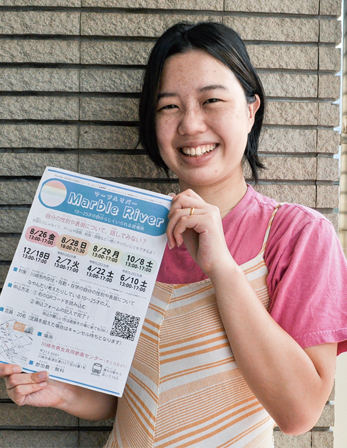川崎市男女共同参画センターと、社会問題解決に向けて活動する団体「イエローロケット」の協働事業。代表の岡野めぐみさん(25)は市内在住。大学卒業後に中高生への性教育や性に関する学びと交流の場を開催するなど、ジェンダーに関わるさまざまな活動を行ってきた。昨年11月に後輩と2人で同団体を設立し、現在は弁護士を目指してロースクールに通いながら活動を続ける。