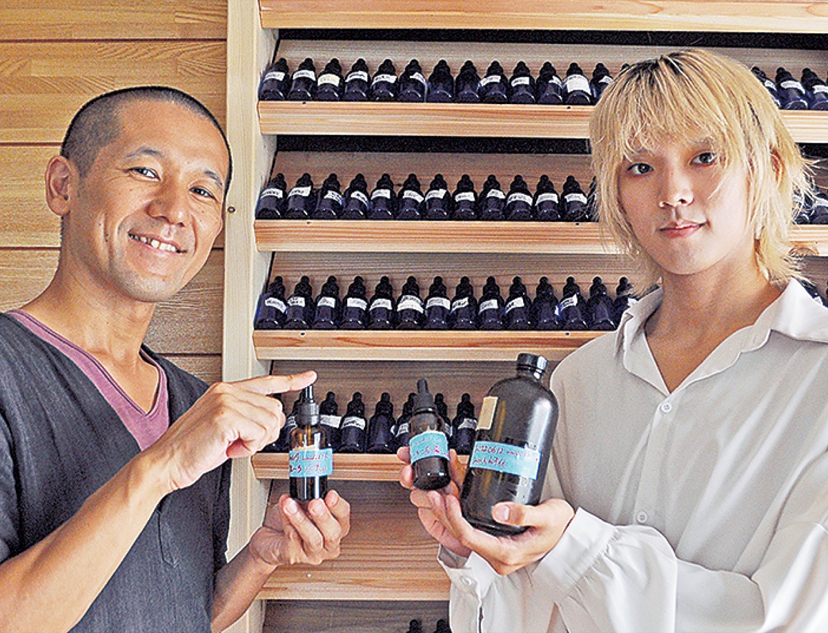 父親の昌也さんが昨年立ち上げた(株)ノンバーバルのアロマ事業「スーベニア アロマ」の企画責任者を務める淳音さん。高校生ながら(公社)日本アロマ環境協会のアロマテラピー検定1級に合格し、アロマブレンドデザイナーなどに認定。自らブレンドしたオイルやマスクスプレーを販売し、市のふるさと納税の返礼品にも認定されている。