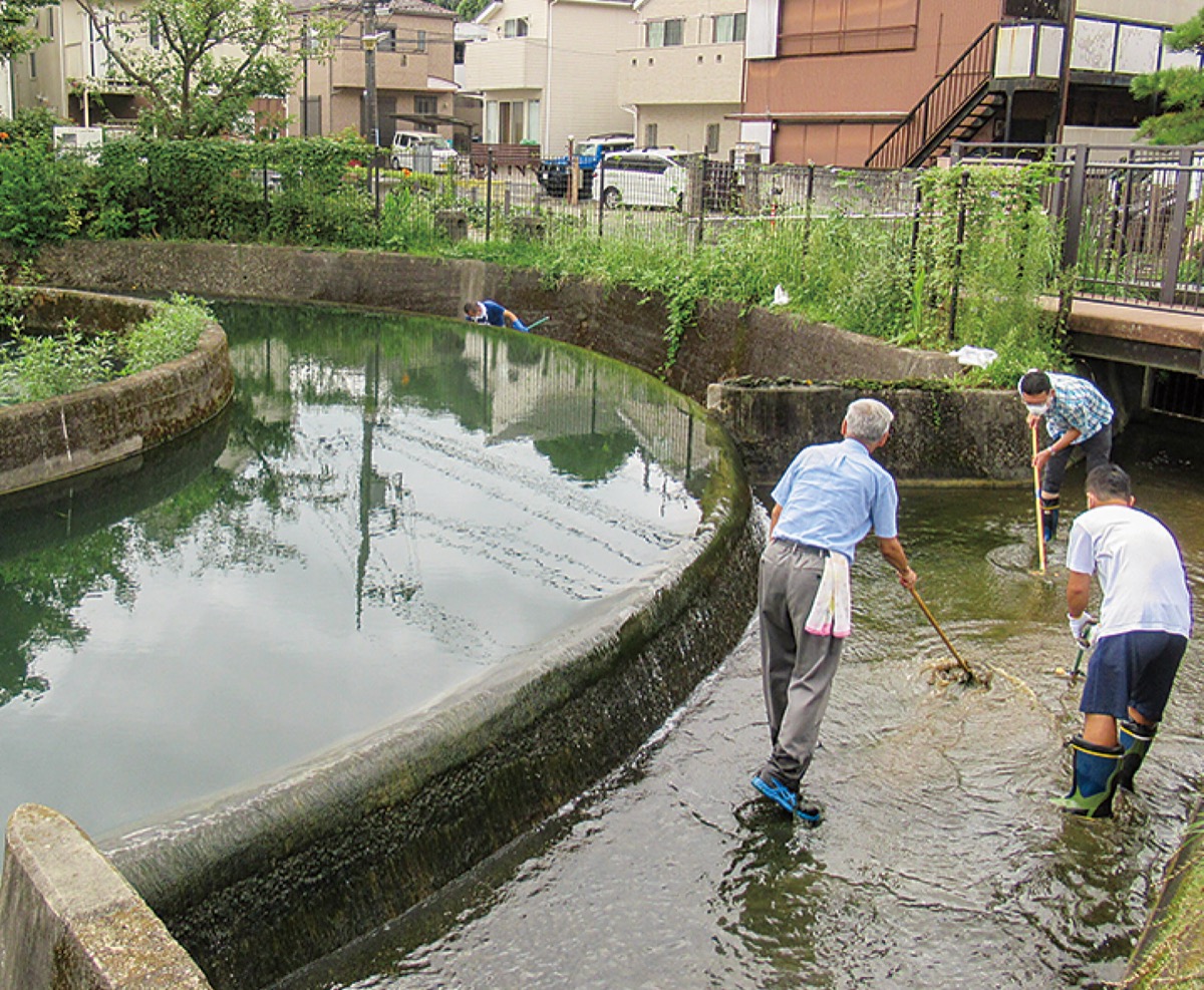 2010年に結成された市民ボランティア団体、久地円筒分水サポートクラブ(吉田威一郎代表)が行っているもので、新型コロナウイルスの影響により3年ぶりの開催となった。当日は一般から9人が参加。広場の草刈りや、普段は入れない水路の清掃などに取り組み、会員や区職員らとともに総勢28人で1時間半ほどの作業に汗を流した。参加者の一人は「皆さんのおかげで円筒分水がきれいに保たれていることがわかった。清掃前後の違いがわかり、達成感がある」と充実感を見せた。