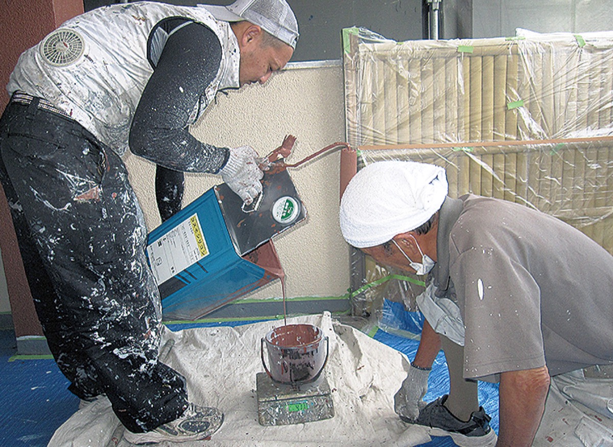 車のガソリンの使用量削減をはじめ、現場でのごみの分別徹底やプラスチックの分別廃棄物量の把握、遮熱・断熱塗料を使った塗り替え工事の積極営業など、実際の取り組みはさまざま。なかでも力を入れたのは、塗料の適量使用による廃棄量の削減だ。同社によると、メーカーでは小分けで販売していないことが多く、少量の使用でも20リットルの缶で購入せざるを得ないケースが多々あるという。「余った塗料は再利用できず、捨てるにもお金がかかり、二酸化炭素の発生にもつながる。塗装業界では廃棄が課題であり一番削減しやすい部分でもある。なるべく余りが出ないよう、細かく計算した」と田中代表。現場を見て必要量の見当をつけ計算上より少なめに発注し、いかに余る量を減らすか、全従業員で取り組んだ。現場では廃プラスチックの再資源化のため分別も徹底、結果として電力使用量や一般廃棄物排出量の削減などを達成した。審査員による書類、現地審査を経て8月31日、認証・登録された。
