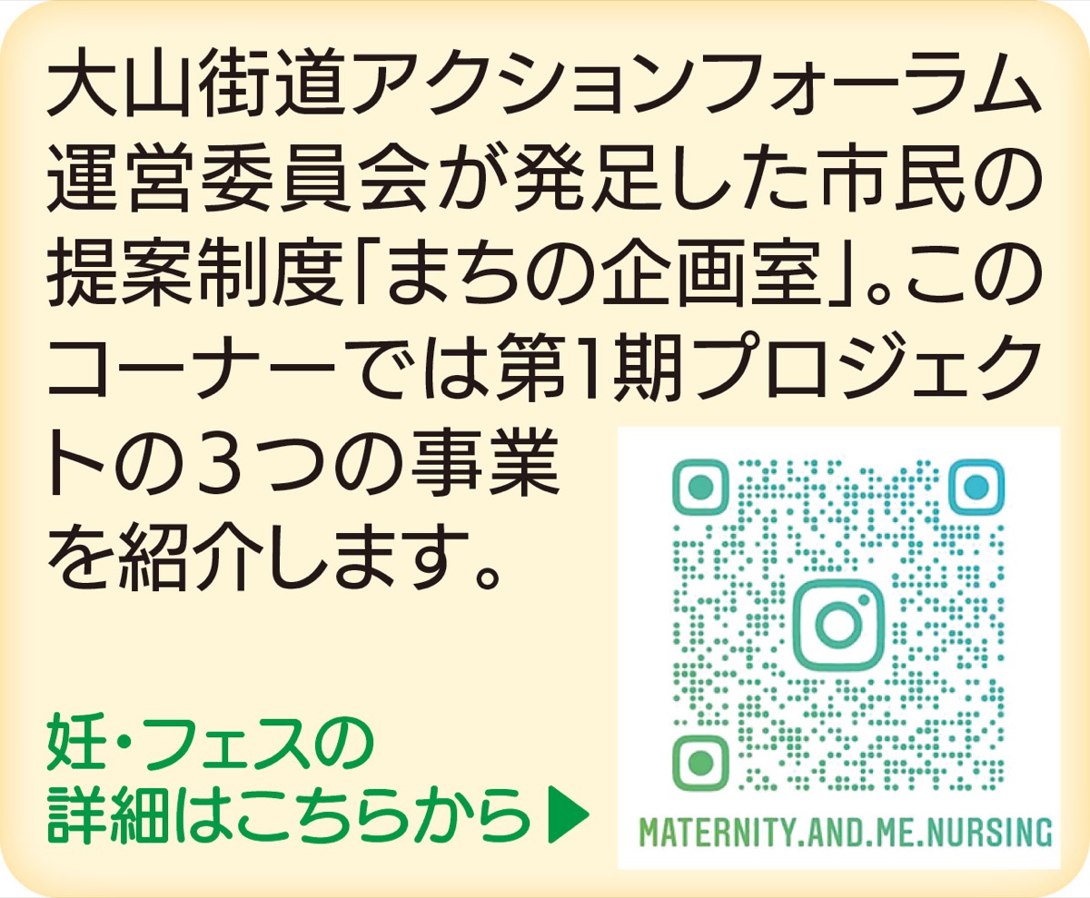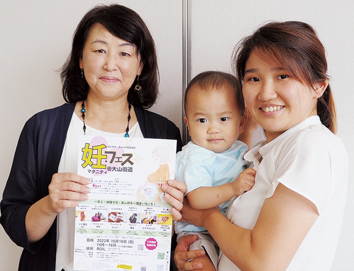イベントは「妊・フェス@大山街道」とし、さまざまな講座を用意。妊娠中から産後まで役立つアロマ講座やセラピストによるアートワーク、男性講師による「プレパパ講座」など多岐に渡る。フォトスペースや妊婦体験、赤ちゃんの抱っこ練習や個別相談も。企画者の一人で自身もコロナ禍での妊娠、出産を経験した山本ともみさん(29)は「妊婦になってみて、一番近い存在の理解がとても助けになった。パートナーの方もぜひ来てほしい」と話している。
