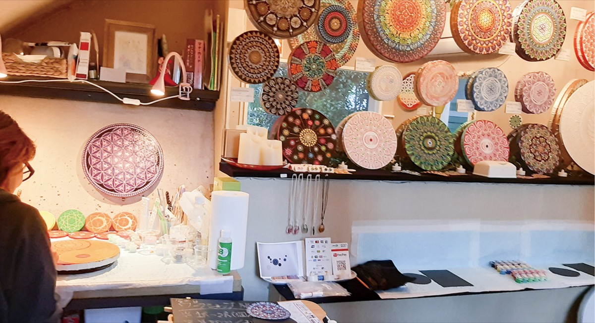 加藤さんが工房を構えるフィオーレの森は、地元でも屈指のパワースポット。「見ているだけでご自身の体調、気持ちを整えるアートなので、ぜひ一度、気軽に足を運んでもらえれば」と来所を呼び掛ける。また金〜日曜日の週末はミニワークショップも行われており、アクリル絵の具を丸いキャンパスにポン!ポン!とリズミカルに点で描いていくドットマンダラの手法を気軽に体験可能(有料)。手先を使って色鮮やかな作品を仕上げられる事から、シニアの認知症予防や、写経における瞑想効果などにも繋がるのでは、といった期待も寄せられている。