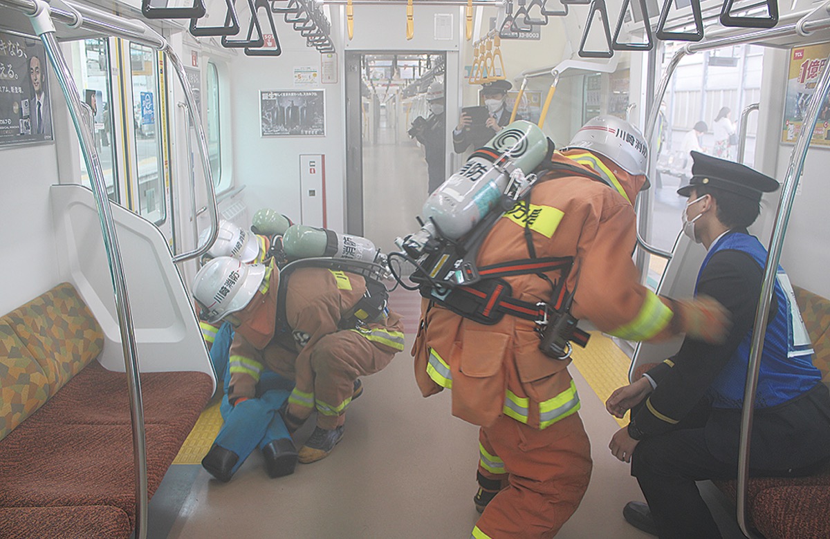 訓練は「JR南武線・川崎方面行きの車両で不審者がガソリンをまいて火をつけ、乗り合わせた乗客数名が負傷した」ことを想定。停車中の車両を使い、3機関から66人が参加した。実践的な訓練で災害時の対応能力の向上を図った。