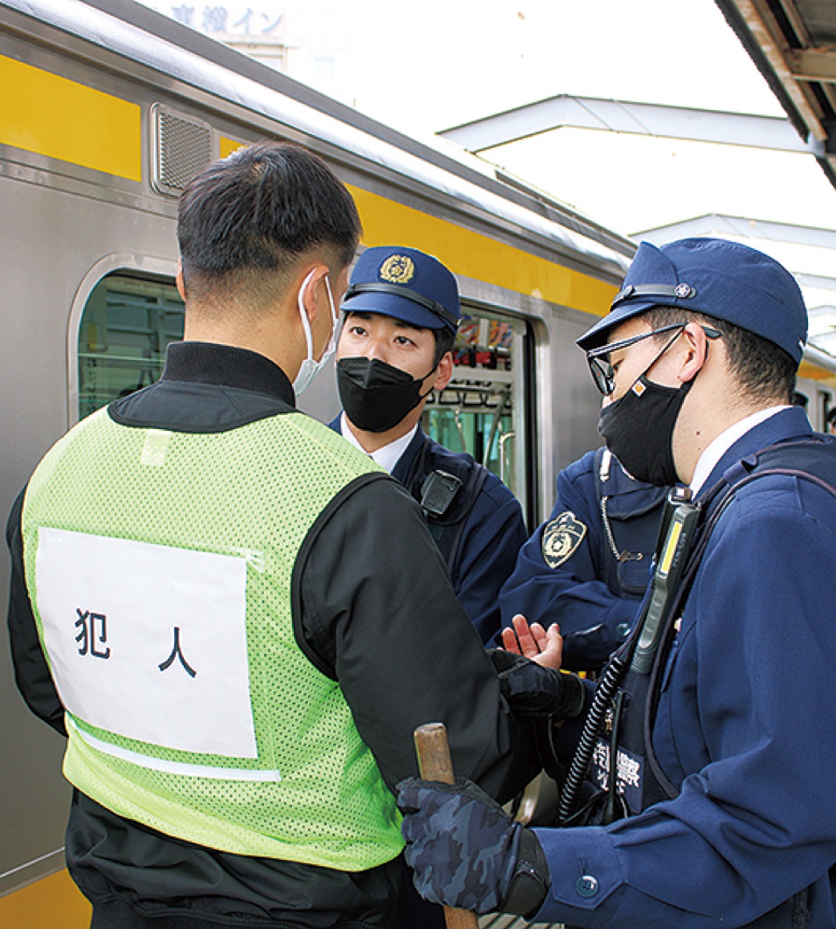 火災発生と同時にJR職員が119番通報するところから開始した訓練。小田中消防隊が駆け付け、煙が充満する車内に取り残された負傷者役2人を救出した。その後、構内まで引いたホースから放水して消化活動を行い、火災を鎮火。発生から26分後には警察署員が被疑者を確保した。参加者らは本番さながらの真剣な表情で取り組んでいた。
