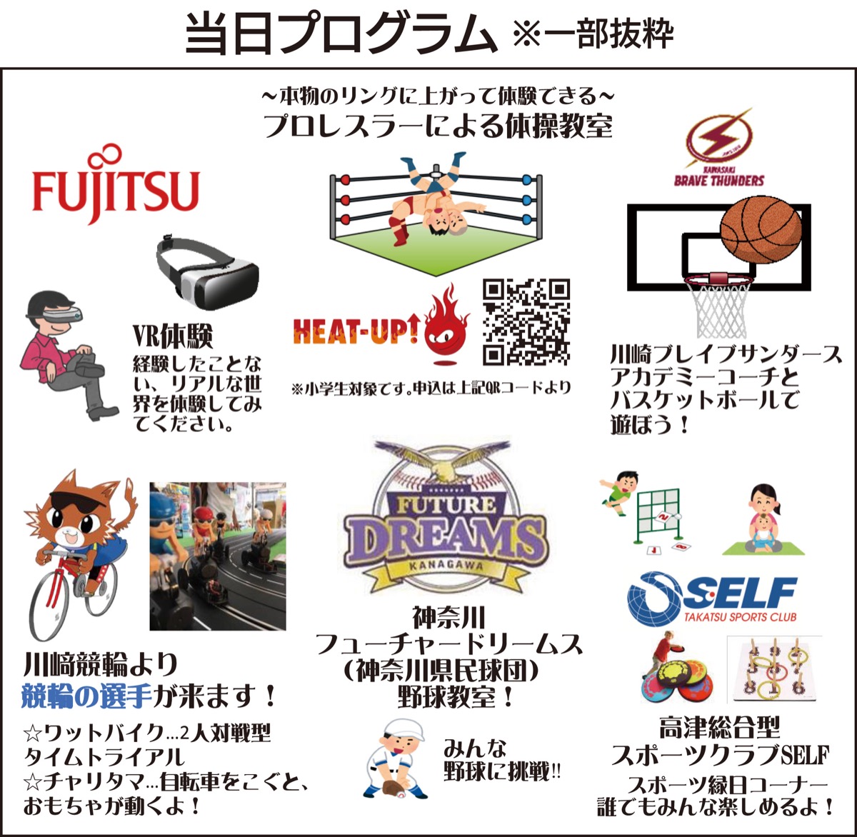 またスポーツ以外にも、高津消防署協力の下、起震車を用いた「防災プログラム」や、坂戸小学校の合唱団と高津中学校の吹奏楽部によるステージなども目玉となっている