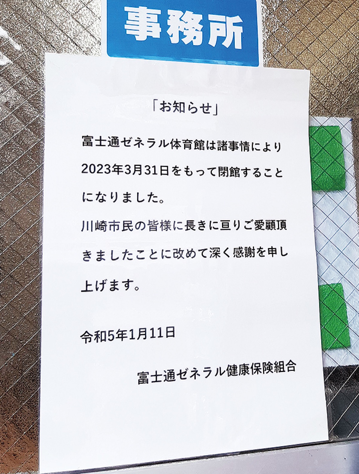 一方で開所から60年以上が経過し、耐震面などの対策が急務となっていたほか、電気系統など各箇所で施設老朽化が進んでおり「大規模な補修工事、または建て替えを行うのでは?」といった声が利用者の間で聞かれていたという。ところが、今年の入って早々、体育館事務所入り口に突如「お知らせ」と題した紙が貼り出だされ「諸事情により3月31日をもって閉館することになりました」との一文。施設の管理運営を請け負うNPO法人 高津総合型スポーツクラブ SELFでは「閉館の知らせを受けたのは昨年暮れ。突然のことで驚いている」とコメント。川崎市の担当者も「(閉館は)すごく残念」としながらも「市として民間企業の施設運営に言及する立場にない」と話している。
