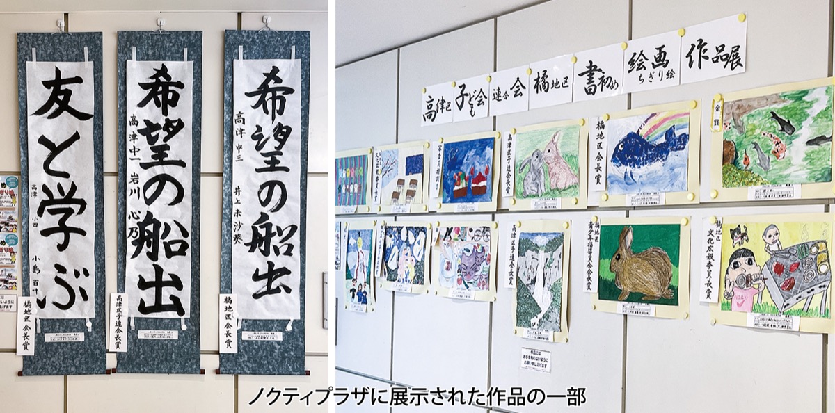 ノクティプラザの5F、9Fにて今月「書初め 絵画 ちぎり絵」の作品展示が行われた。この企画は、1月8日に橘小学校アリーナで、橘地区の子ども会に所属している小学1年から中学3年が制作した作品を掲示したもの。制作時は区内の書道教室の講師や横浜美術大学の助教授、中学校の美術部の顧問らが指導や審査に協力。「書初め」が33点、「絵画、ちぎり絵」25点がそれぞれ集まり、その中で審査を経て高評価を受けた入賞作品が展示された。