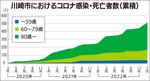 下記のグラフは、本市におけるコロナ感染・死亡者数の推移です。昨年夏に始まった第7波以降、50代以下の死者はほとんど出ていませんが、逆に高齢者、とりわけ80歳以上の死者数は、むしろ増加傾向を示しています。とくに、基礎疾患があり、ワクチン未接種の方のリスクが高く、感染予防策が重要となっています。