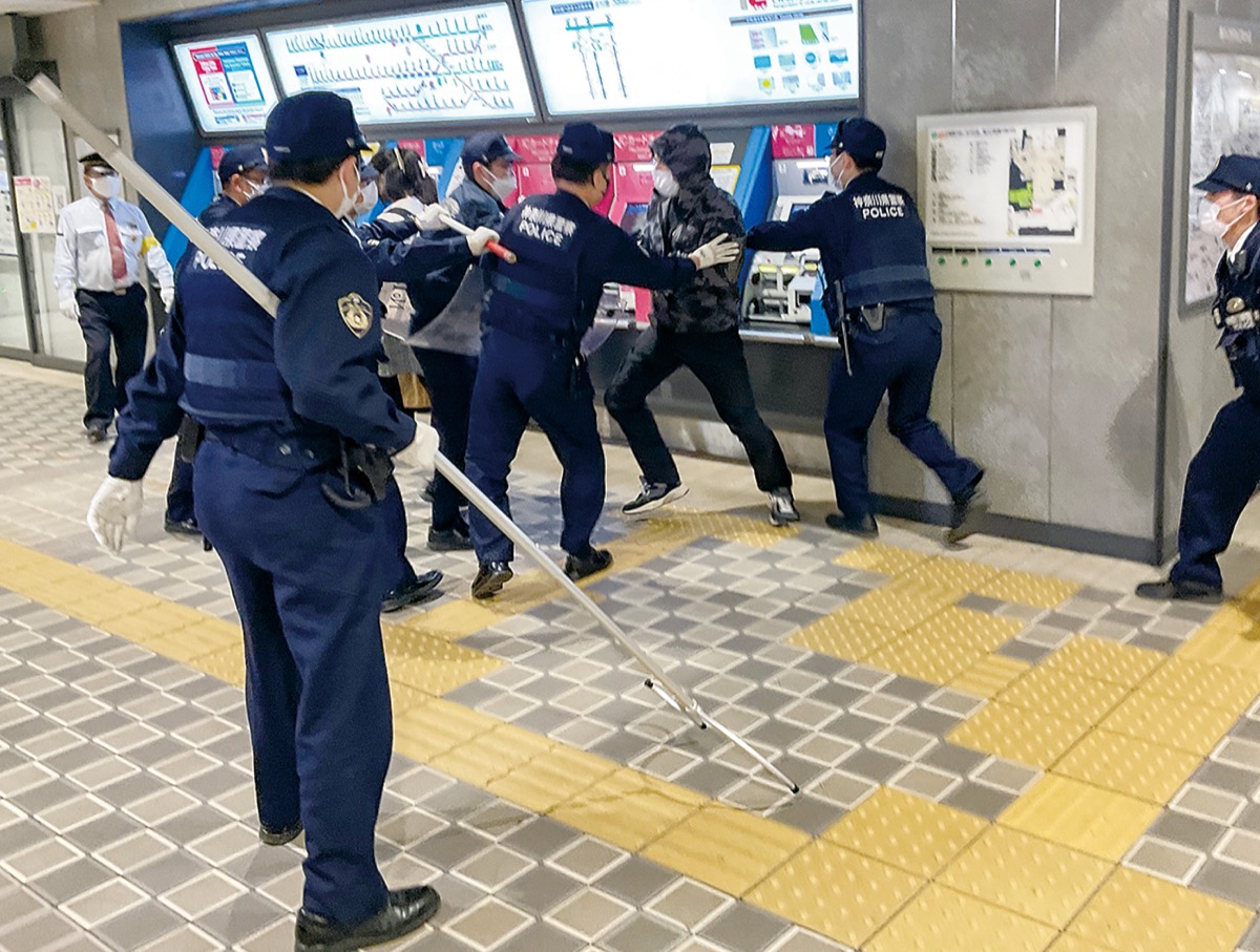 高津警察署(前田俊明署長)は2月2日、警視庁玉川警察署と連携して、東急溝の口駅で「刃物使用による連続殺傷事件」を想定した合同緊急配備訓練を実施した。
