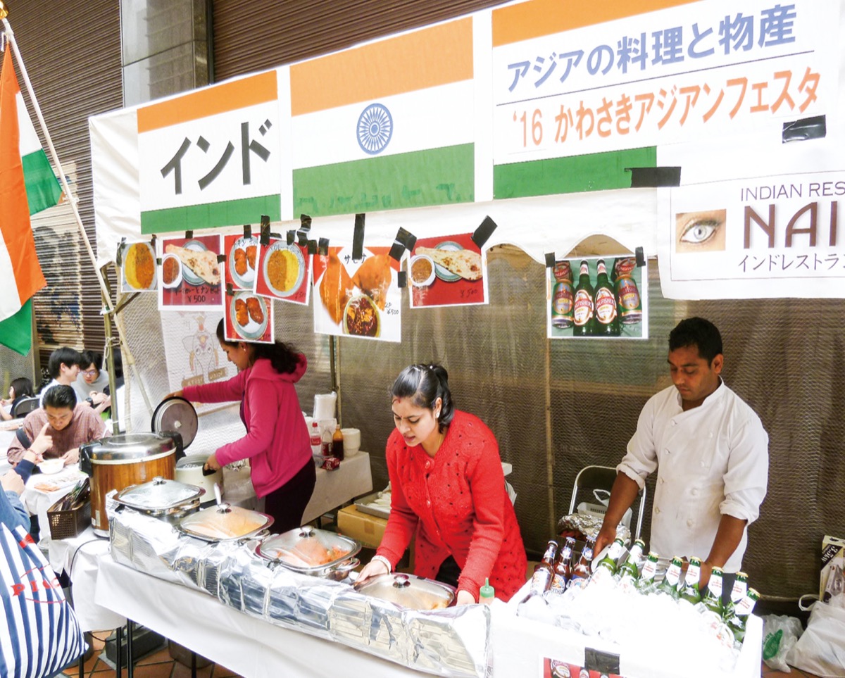 かわしんふれあい広場横には、インドやベトナムの料理など数多くのアジア料理が楽しめる「アジア屋台村」が4年ぶりに復活。8店舗の屋台が軒を連ねる。