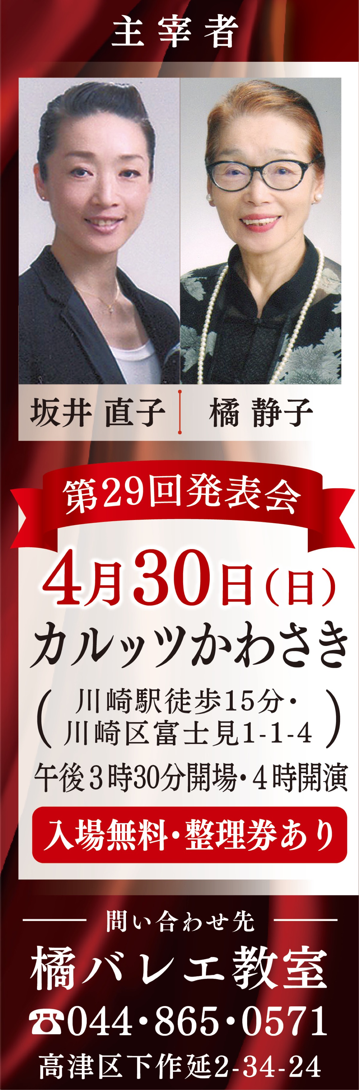 今年、創立60年を迎える橘バレエ教室(下作延)が4月30日(日)、「カルッツかわさき」で第29回発表会を開催する。