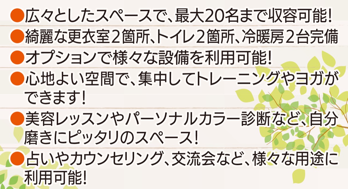 区内で不動産管理などを手掛ける「株式会社 恒川」(真野明子代表)が、癒しをテーマとしたレンタルスタジオをオープン。現在、利用見学などを受け付けている。