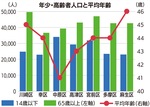 下記のグラフは、14歳以下の年少人口や65歳以上の高齢者人口、そして平均年齢を行政区別に比較したものです。中原区のように高齢者と年少者の人口がほぼ同数の区がある一方で、川崎区のように2倍差の区もあります。また、麻生区と中原区では区民の平均年齢が5歳も違っていることが、一目でわかります。ちなみに高津区は年少人口も高齢者人口も多く、川崎市内では比較的バランスのとれた地域といえます。