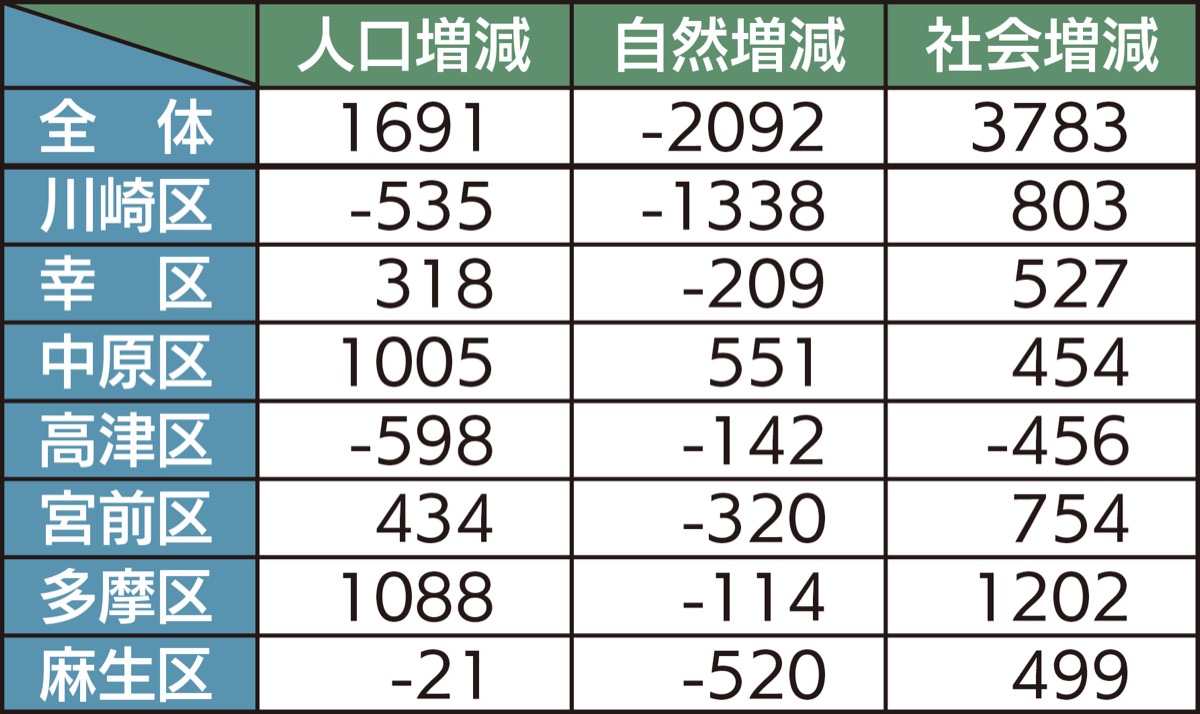 区別では、人口増加が最も多かったのは多摩区の1088人。次いで中原区の1005人だった。一方で、川崎区、高津区、麻生区は減少。高津区は598人減少し、1972年以来、初の減少となった。川崎区は535人減で3年連続、麻生区は21人減で2年連続の減少となったが、減少幅は前年よりもそれぞれ1382人、10人と縮小した。
