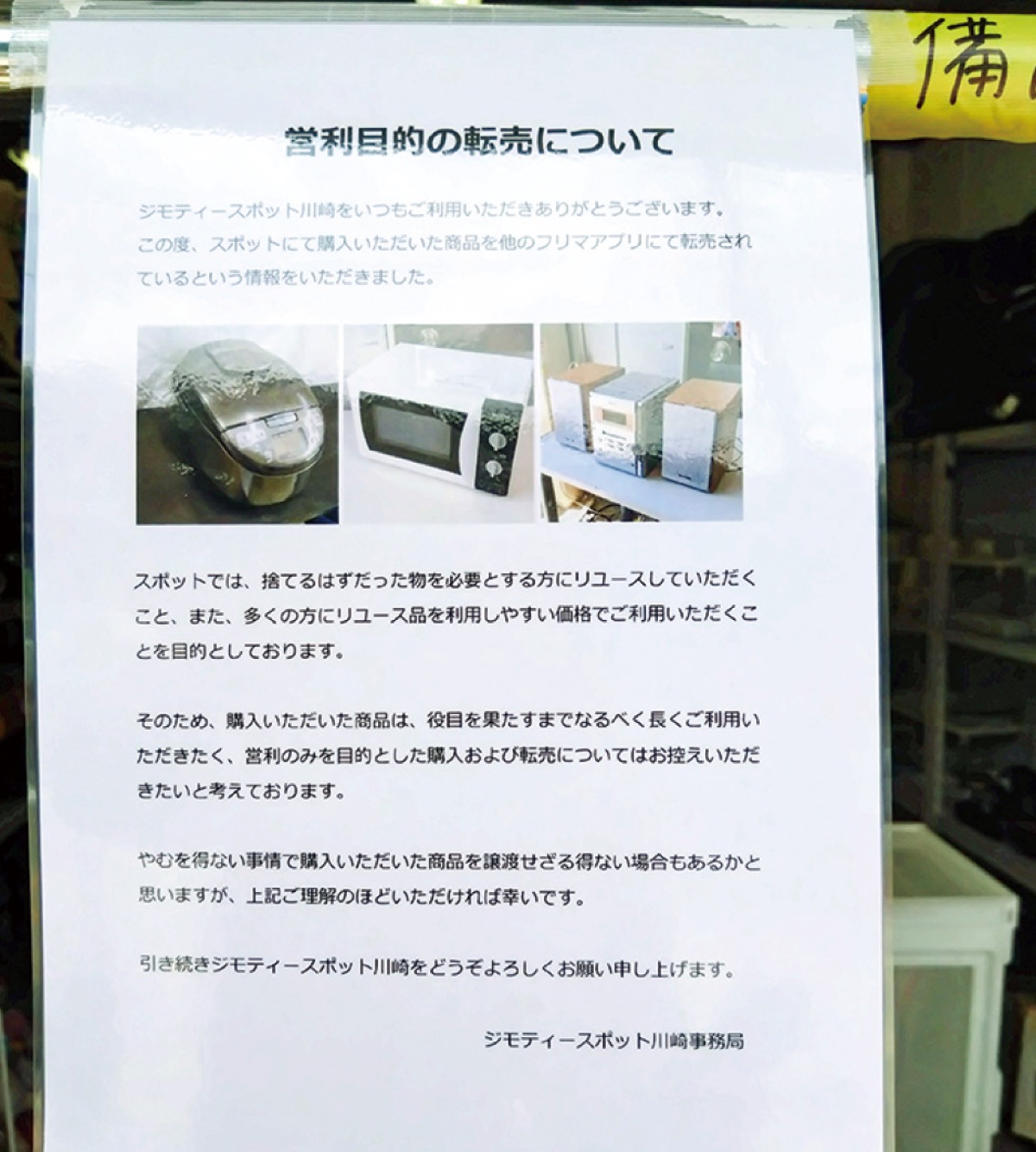 地域に着実に浸透しつつある一方で、一部の心ない利用者が、譲り受けた物品をフリマサイトなどで転売する事象が発生。施設内の一角に注意を喚起するチラシが掲出されている。運営事務局では「当所の目的は『地域資源の循環』。(転売目的での来店については)どうか良識のある利用を心掛けてもらいたい」と呼び掛けている。