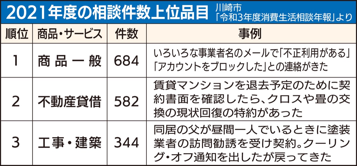 消費者庁は先月を消費者月間に定め、今年は「デジタルで快適、消費生活術〜デジタル社会の進展と消費者のくらし〜」をテーマに掲げた。一方、デジタル化に伴う消費者トラブルは年々増加。川崎市消費者行政センターでは相談事例集の作成、行政推進計画の策定など啓発を進める。