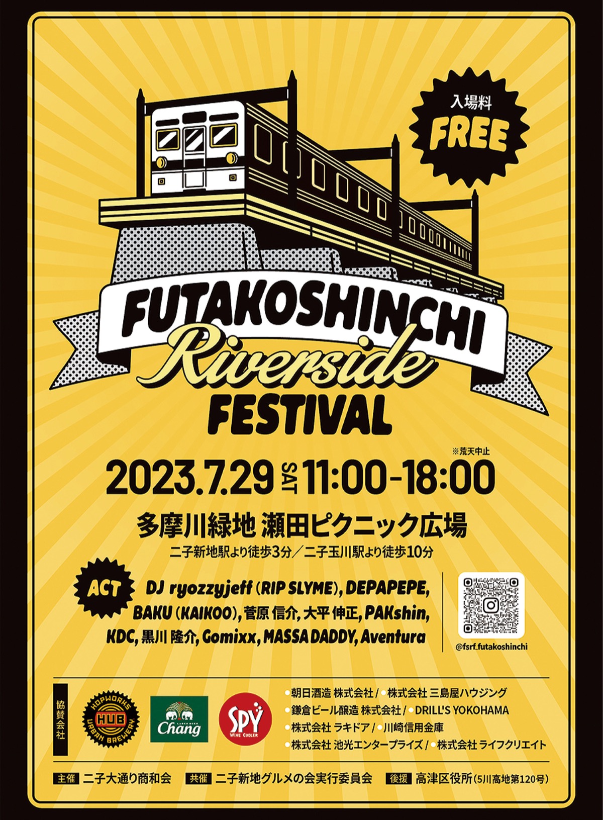 高津区役所も後援するこのイベントは、地域活性化と経済への貢献、さらに持続可能なフェス文化形成等を目的に企画されたもの。『FUTAKOSHINCHI Riverside FESTIVAL 』(二子新地リバーサイドフェスティバル)と銘打ち、当日は「多摩川緑地 瀬田ピクニック広場」(二子新地駅より徒歩3分)を会場に、いずれも二子新地界隈にゆかりのある豪華アーティスト11組が出演を予定(左下表プログラム参照)。また会場には多彩な飲食ブースの出店も予定されており関係者は「夏の暑い日差しを浴びながら、美味しい食べ物と飲み物と豪華アーティストが出演するライブをお楽しみ下さい」と話し、多くの来場を呼び掛けている。開催時間は午前11時から午後6時で、来場やステージ観覧は無料となっている。