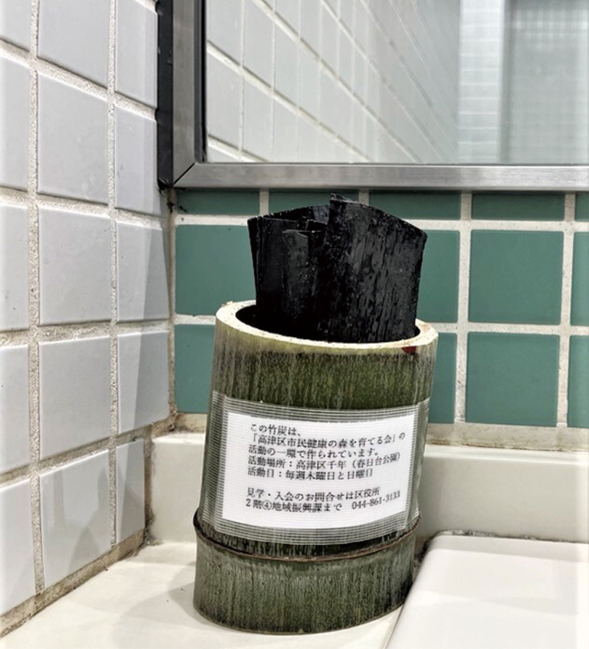 また昨年から区役所と橘出張所へも竹炭を提供しています。そこでは竹で作った容器に竹炭を入れてトイレに置いて頂いています。容器には私たちの制作であることを書いたラベルを張っており、少しでも区民の皆様に私たちの活動を知って頂けたら、との思いです。竹炭を焼けるのは区役所道路公園センターさんのお陰です。春日台公園開設時に炭焼き窯と炭焼き小屋を作って頂いたのが道路公園センターさんでした。炭焼きに限らず、私たちの活動は区役所に支えて頂いています。