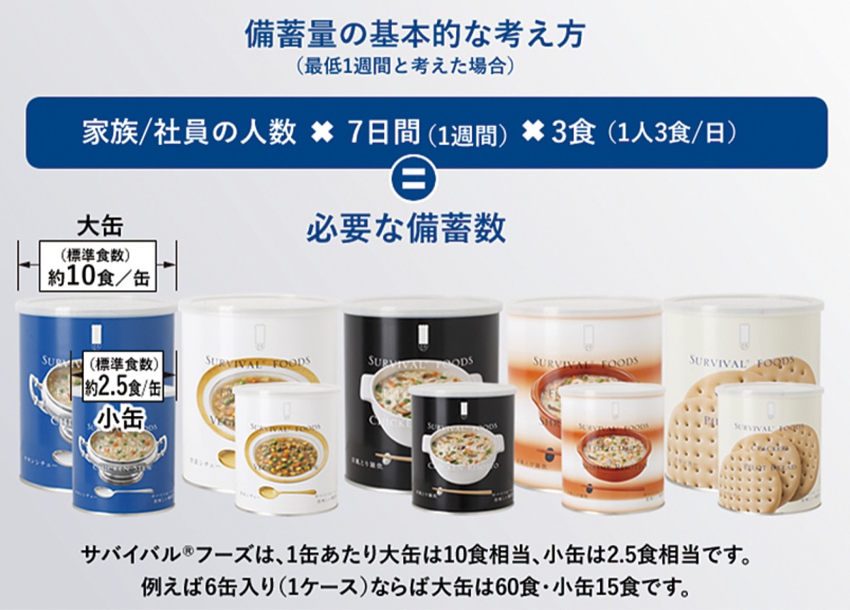 「建物調査」や「建物診断」の紹介なども手掛ける同社では、防災情報も幅広く提供。その一環として、同社が取り扱う備蓄食「サバイバル®フーズ」を参考例に、被災時に必要となる「非常食の数」を解説してくれた(左上欄参照)。