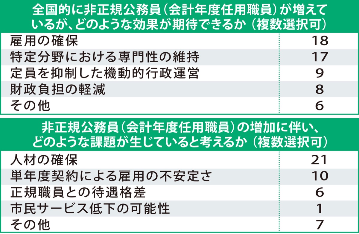 効果では「雇用の確保」が18、「特定分野における専門性の維持」が17と多く、人手不足や多様化する職務の中で、非正規職員を重要な戦力としてとらえている傾向が見える。続いて「定員を抑制した機動的行政運営」は9、「財政負担の軽減」は8だった。