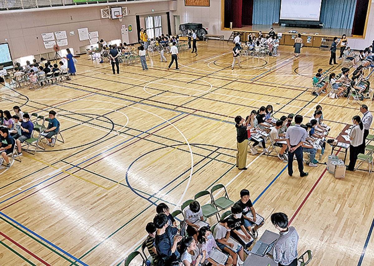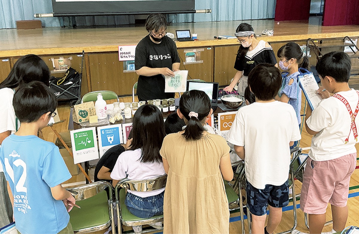 当日は、市内の企業や市民団体ら14社が参画し、児童たちに環境への意識や関心を高めてもらうべく「ゲスト講師」を担当。校内の体育館などに各企業や団体がブースを設け、5年生の児童約160人がグループごとに分かれてワークショップ形式の授業に臨んだ。