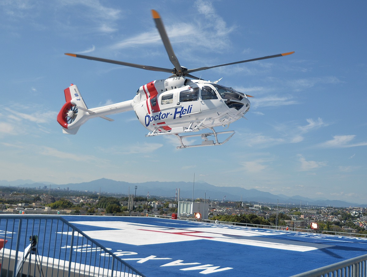 ヘリコプターは風向きにより、入院棟の南側か北側から離着陸する。大規模災害時には、消防や警察のヘリコプターが飛来することもあるが、ヘリポートの耐荷重は8トンのため、大型のヘリコプターは離着陸できないという。
