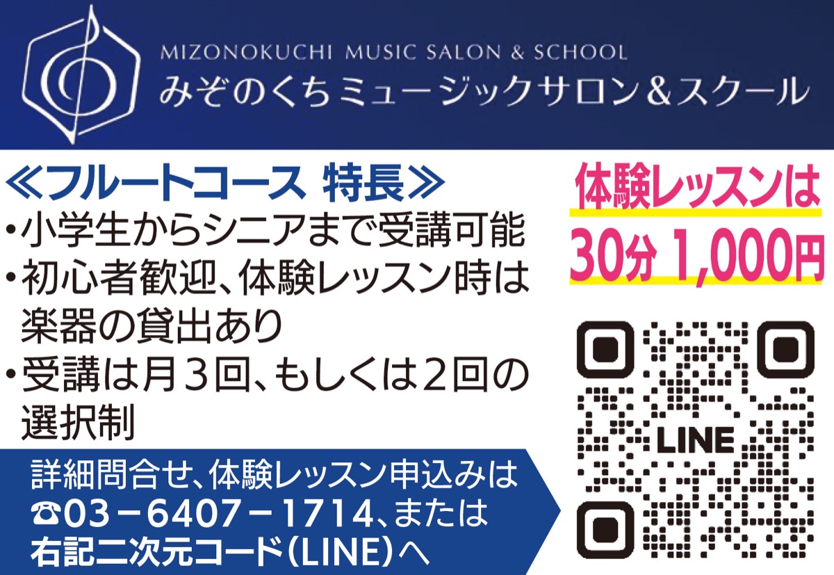 溝の口駅にほど近い「溝ノ口劇場」建物4階の「みぞのくちミュージックサロン&スクール」が日曜日に「フルートコース」を開講。受講生を広く募っている。