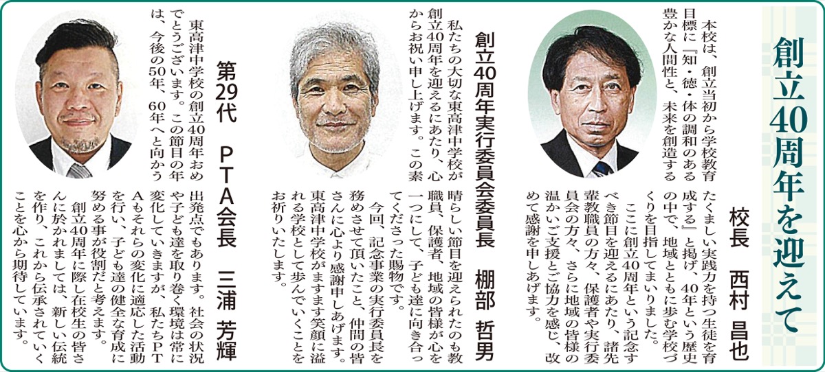 川崎市立東高津中学校(末長1274の7・西村昌也校長・生徒数553人)が今年、創立40年の記念の年を迎えた。同校は10月21日に「創立40周年記念式典」と祝賀会を開催。PTAや地元関係者ら来賓も集い、校舎全体で祝福のムードを醸し出していた。