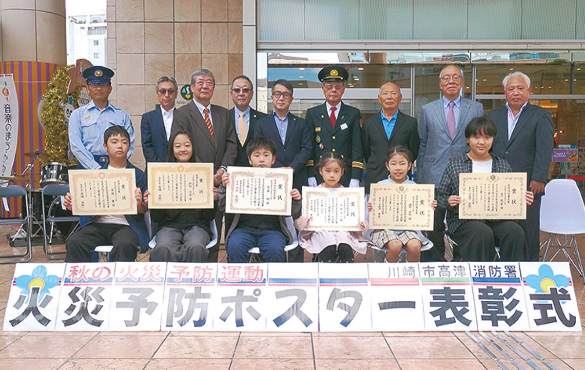 火災予防ポスターの表彰式が行われ、遊佐帆乃夏さんと磯野希帆さんが高津消防署長賞、中野ゆうさんと高橋瑛さんが高津防火協会長賞、新垣沙季さんと高橋慶さんが高津区長賞を受賞した。