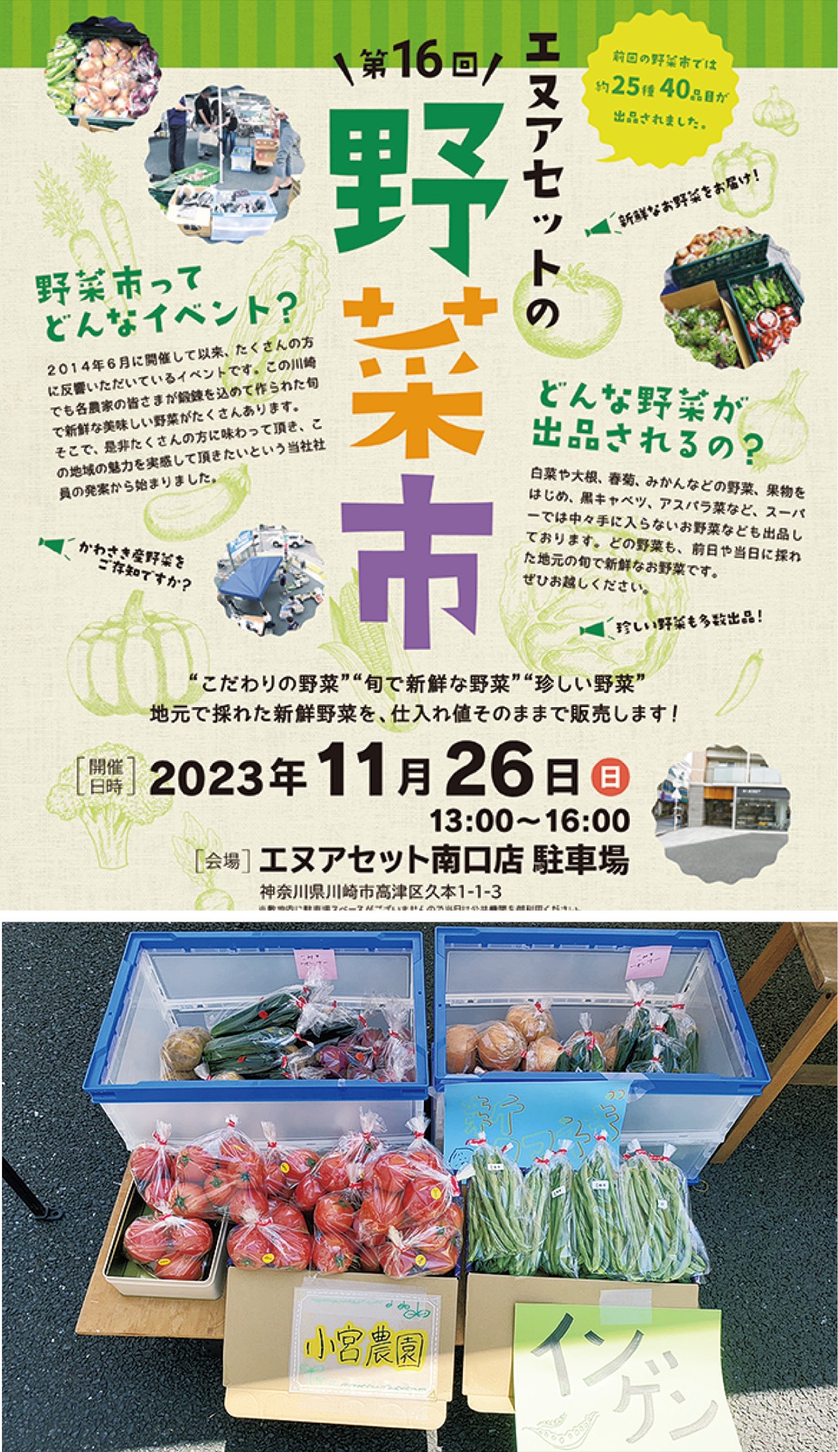 川崎市内の農家で丹精込めて作られたこだわりの野菜を味わい、地域の魅力を実感してもらいたいとの思いから地元不動産会社「(株)エヌアセット」が手掛けているもの。2014年から開催し、今回で16回目。会場では、白菜や大根、春菊、みかんなどの旬野菜のほか、黒キャベツやアスパラ菜といったスーパーではなかなか手に入らない野菜の採れたてが出品される予定となっている。