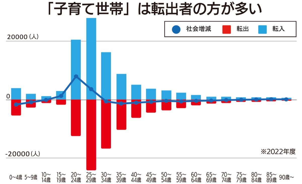 川崎市の人口は154万人を超え、いまだ増え続けており、その要因は、転入者の方が転出者よりも多い「社会増」です。しかし、転出入者数を年代別にみると、転入者の方が多いのはごく一部の年齢層に限られています。