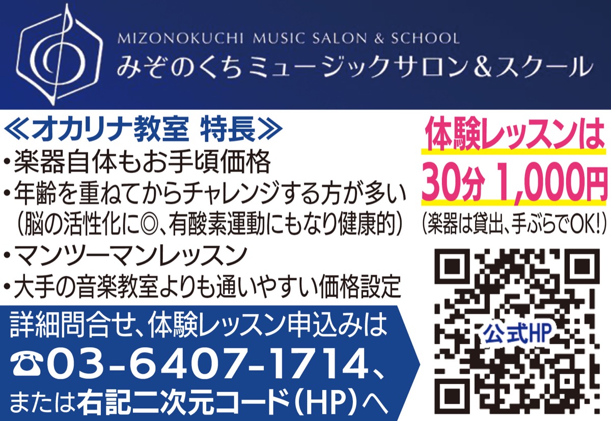溝の口駅にほど近い「溝ノ口劇場」建物4階の「みぞのくちミュージックサロン&スクール」が日曜日に「オカリナ教室」を新規開講。受講生を広く募っている。