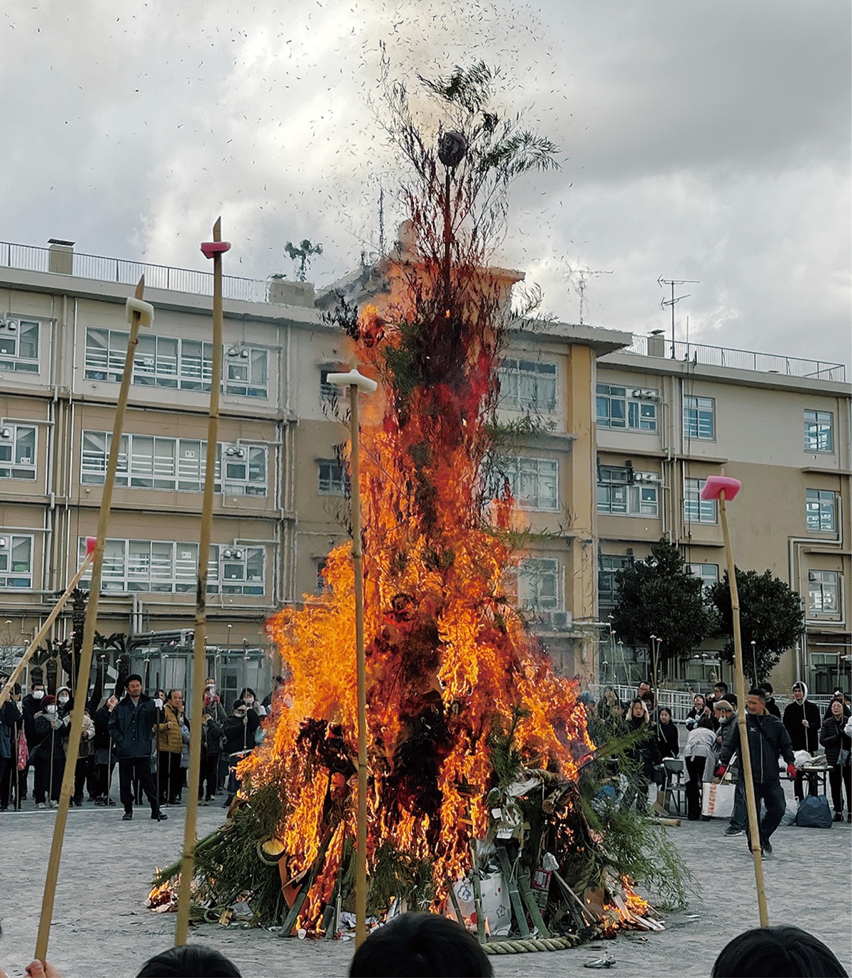 お正月に飾っていた門松・竹・注連縄(しめなわ)などを集めて焚く、伝統行事「どんど焼き」が市内各所で行われた。地元会場のひとつ、久末小学校では1月13日に近隣住民など約400人が参加し催行。竹竿付きの餅を焚き上げた火にかざしてこの1年の無病息災を祈っていた。