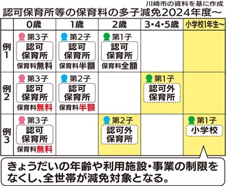 川崎市は4月から多子世帯支援として、保育料のきょうだい減免を全世帯に拡大する。きょうだいが同一園に入所できるよう利用調整基準も変更。第3子以降の経済支援策は先月、国でも決定されたが、市独自の少子化対策の一手として進めていく考え。