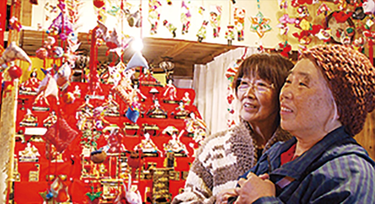 かつて、この地で医業を営んでいた岡家の建造物を整備した「久本薬医門公園」を会場に開催されるこの催し。同園の特徴的な存在として知られる大きな「蔵」を会場に、その内部の構造を活用してひな人形を7段飾りで展示するほか、地元の老人クラブ「久本長生会」の手芸クラブメンバーが制作した「吊るし雛」も多数出品。壁面三方がひな祭りムード一色となる光景は圧巻で、今回も来場者を魅了する。