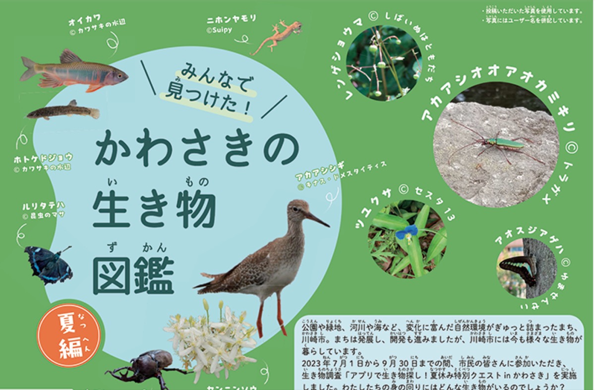 クエスト(課題)は「川崎市でみつけた10種類の生き物を撮影し、投稿すること」で、市内で撮影された1万2052件の投稿が寄せられた。これを学校や家庭での環境教育に使いやすいように分類し、投稿写真をちりばめつつ計8ページに編集した(二次元コードから閲覧可能)。