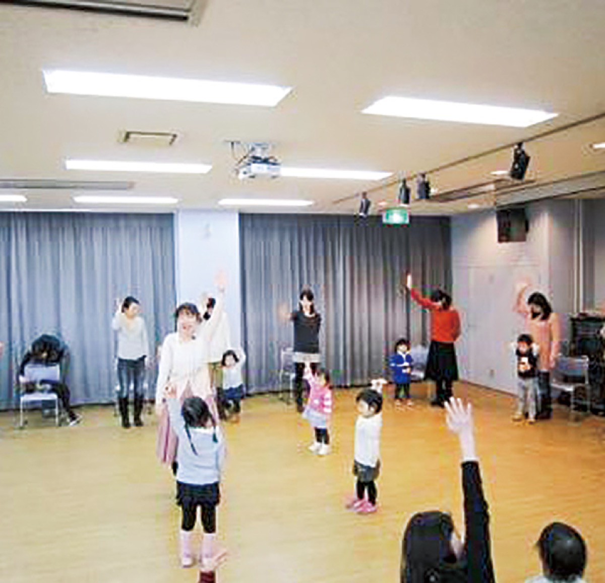 幼児対象の親子参加型の歌とリトミック。ピアノに合わせて、親子でリズムをたたいたり歌ったり。毎週金曜日午前中1時間、会場は「てくのかわさき」ホール。講師は桜井純恵さん。