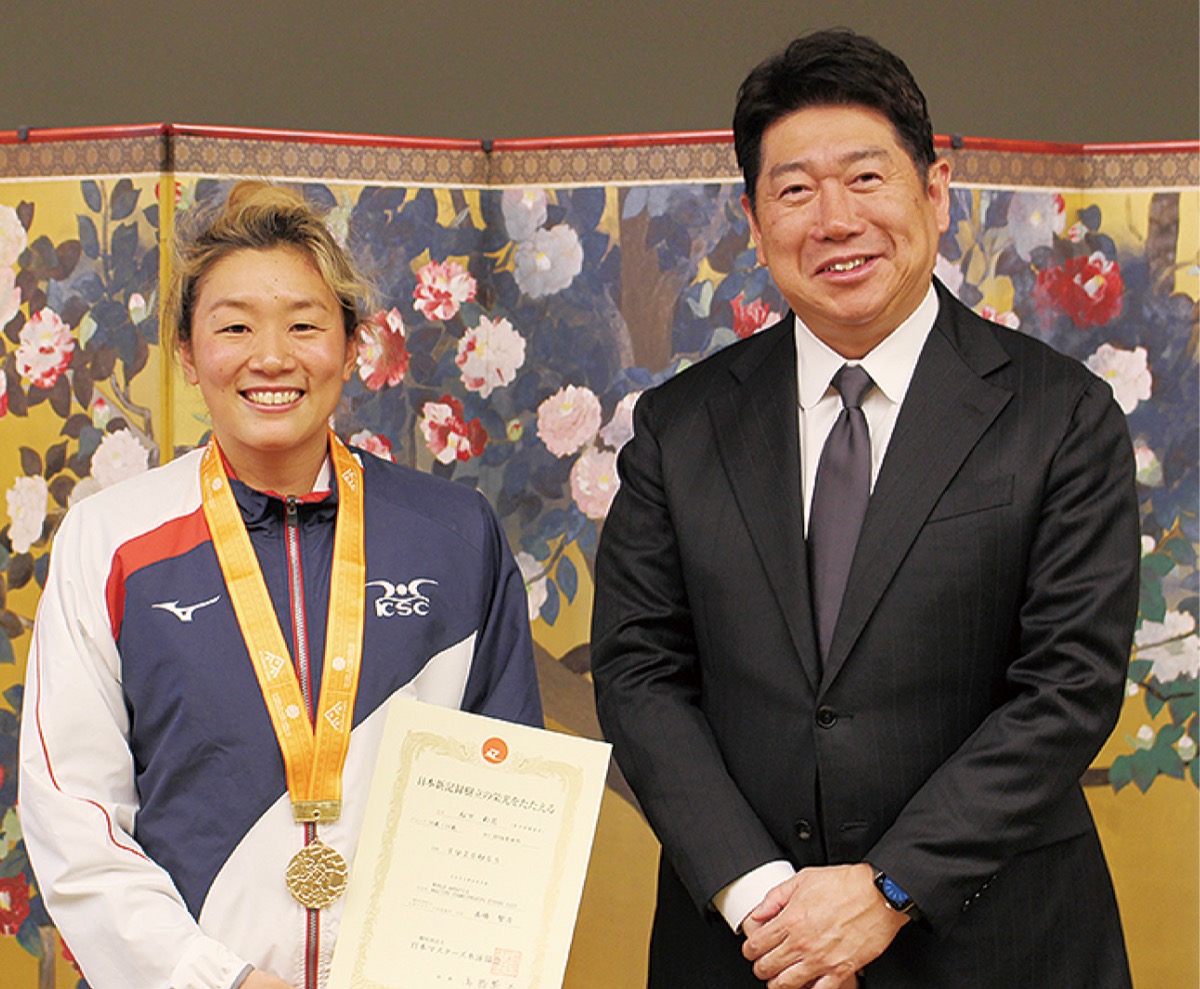 宇奈根にある「カワサキスイミングクラブ」に所属する松下彩花さん(諏訪在住)が、昨年夏に行われた「世界マスターズ水泳選手権」(25歳以上を対象とした年齢区分のある競技競泳大会)で好成績を残し、3月12日には福田紀彦市長を表敬訪問。快挙達成を報告した。