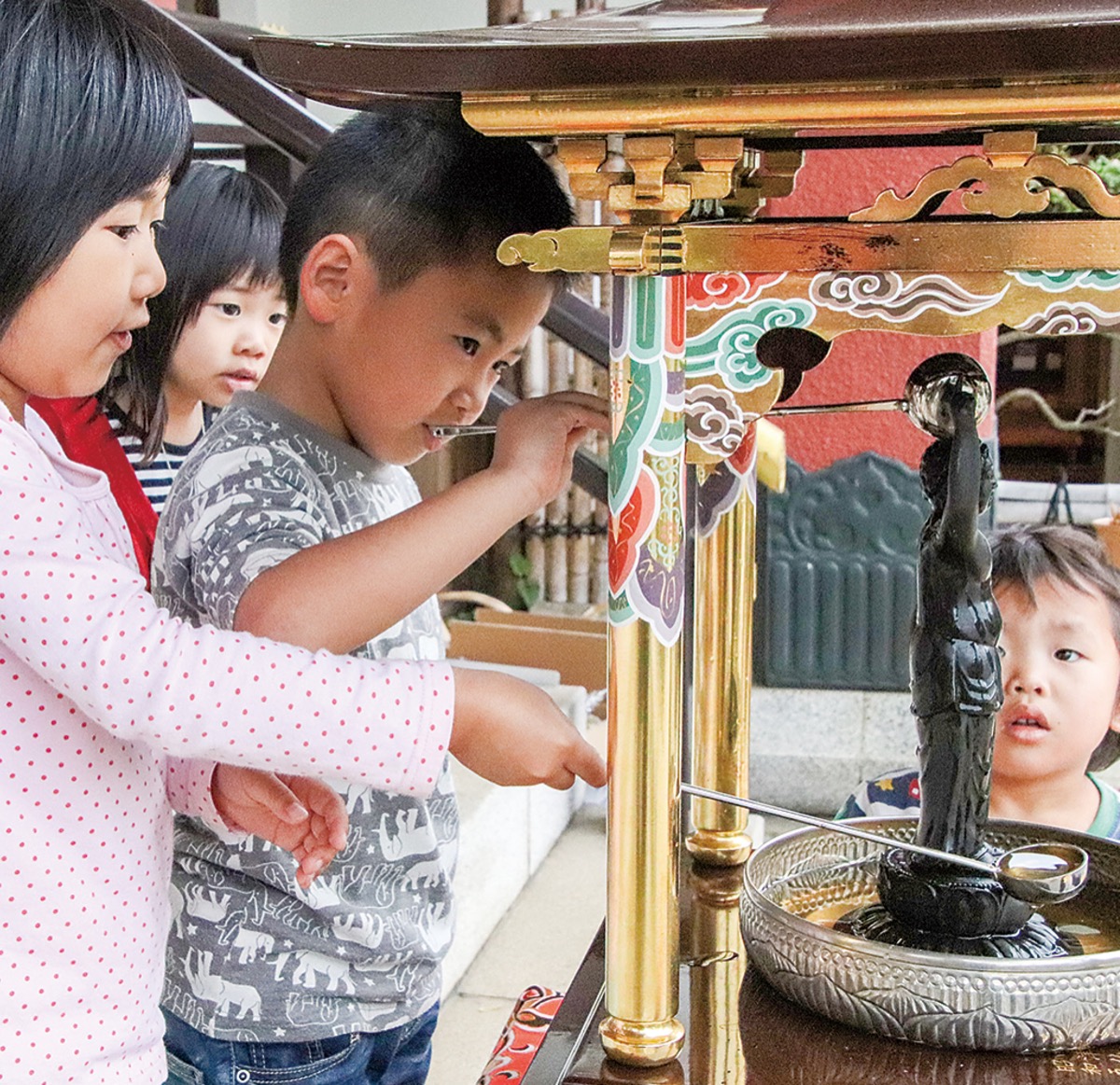 花まつりでは、花で飾られたお堂に立つ釈迦像に「甘茶」をかけて参拝するのが習わし。スタンプラリーの発起人で大蓮寺の住職を務める大橋雄人さんは「花まつりは(キリストの誕生を祝う)クリスマスに比べてあまり知られていないと感じていた。楽しみながらこうした習わしや由来などを知ってもらえたら」と思いを話す。