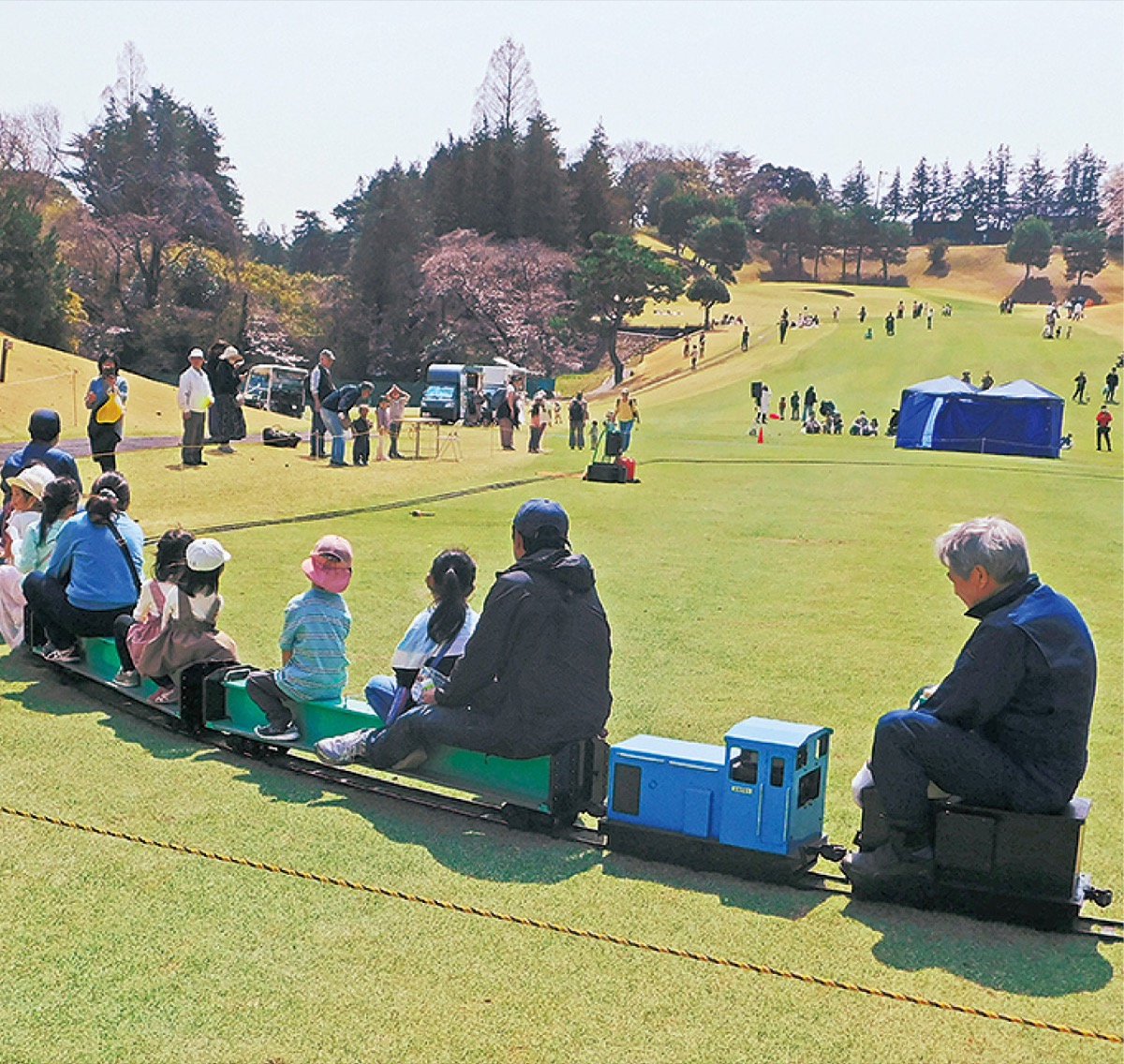 スナックゴルフや芝すべり、的当て、スーパーボールすくい、動物とふれあうことができる企画などが並んだ。広々としたゴルフ場内をミニSLに乗って走るコーナーもあった=写真。同ゴルフ場支配人の菊田哲治さんは「予定通り開催され、楽しんでもらえた」と振り返った。