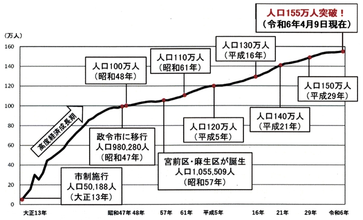川崎市は1924年(大正13年)に人口5万188人でスタートし、以後人口が増え続け、政令指定都市に移行した翌年の1973年に100万人、2017年に150万人をそれぞれ突破した。