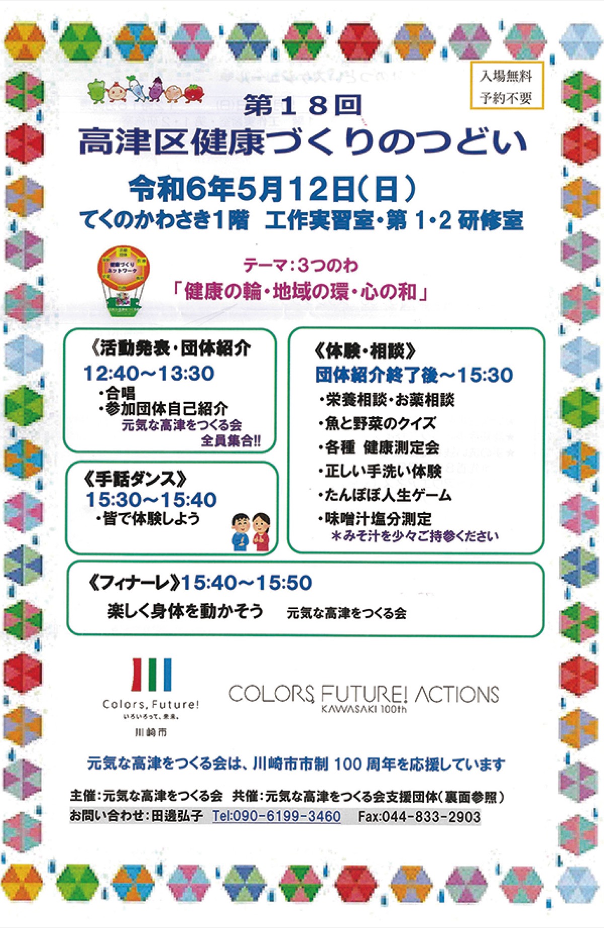 活動のメインとなっているのが、参画メンバーを含む地元エリアの健康づくりグループや団体が一同に会する「高津区健康づくりのつどい」の主催。健康志向の高まりを受け、年々知名度を高めるこの催しは、高津区の風物詩にも数えられており、今年も5月12日(日)、午後12時40分から「てくのかわさき」(溝口1の6の10)で行われる。