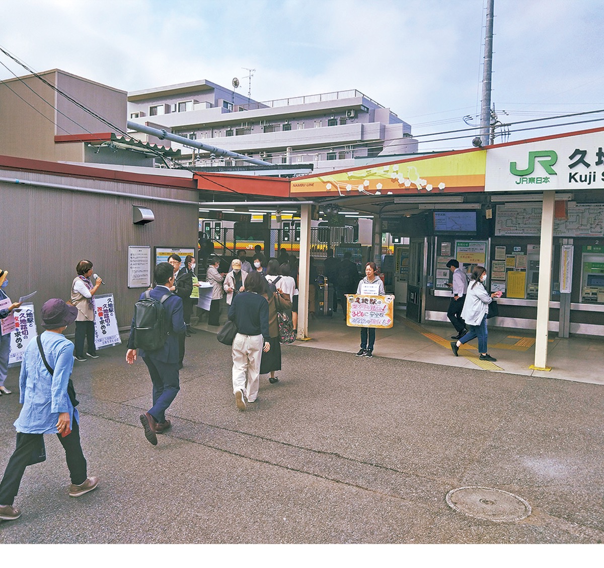 JR南武線・久地駅と、至近の踏切の改善を求める区民有志らの署名活動が今春3年目を迎えた。「駅舎橋上化の実現」と「賢い踏切の早期設置」等を目指すメンバーは改札前で定期的に活動しており多くの協力を呼び掛けている。