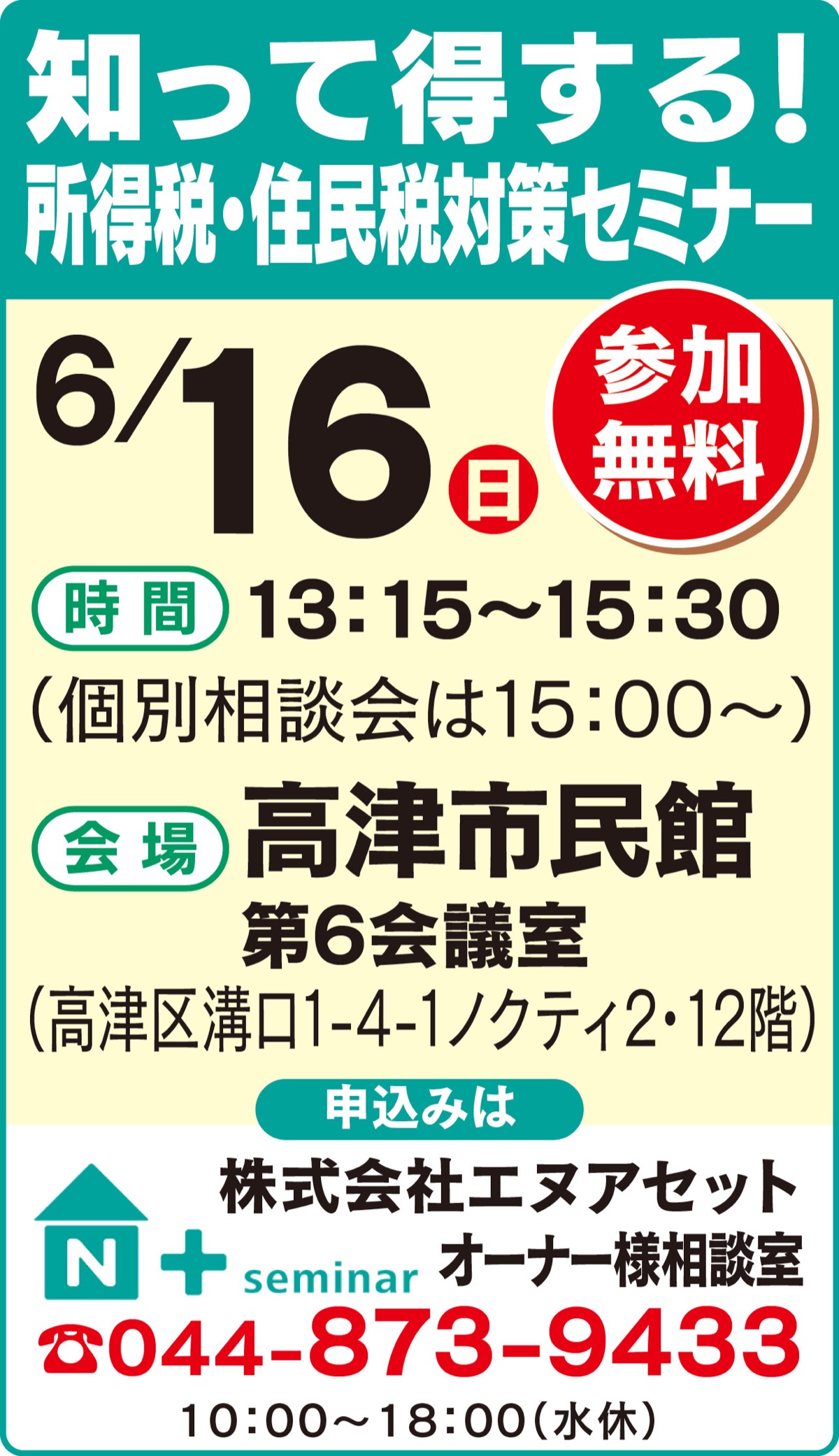 賃貸経営では、税金対策をしていないと「所得税が高い…」と負担になることも。高津区の不動産会社「(株)エヌアセット」は6月16日(日)、賃貸不動産オーナー向けに「知って得する!所得税・住民税対策セミナー」を開催する。
