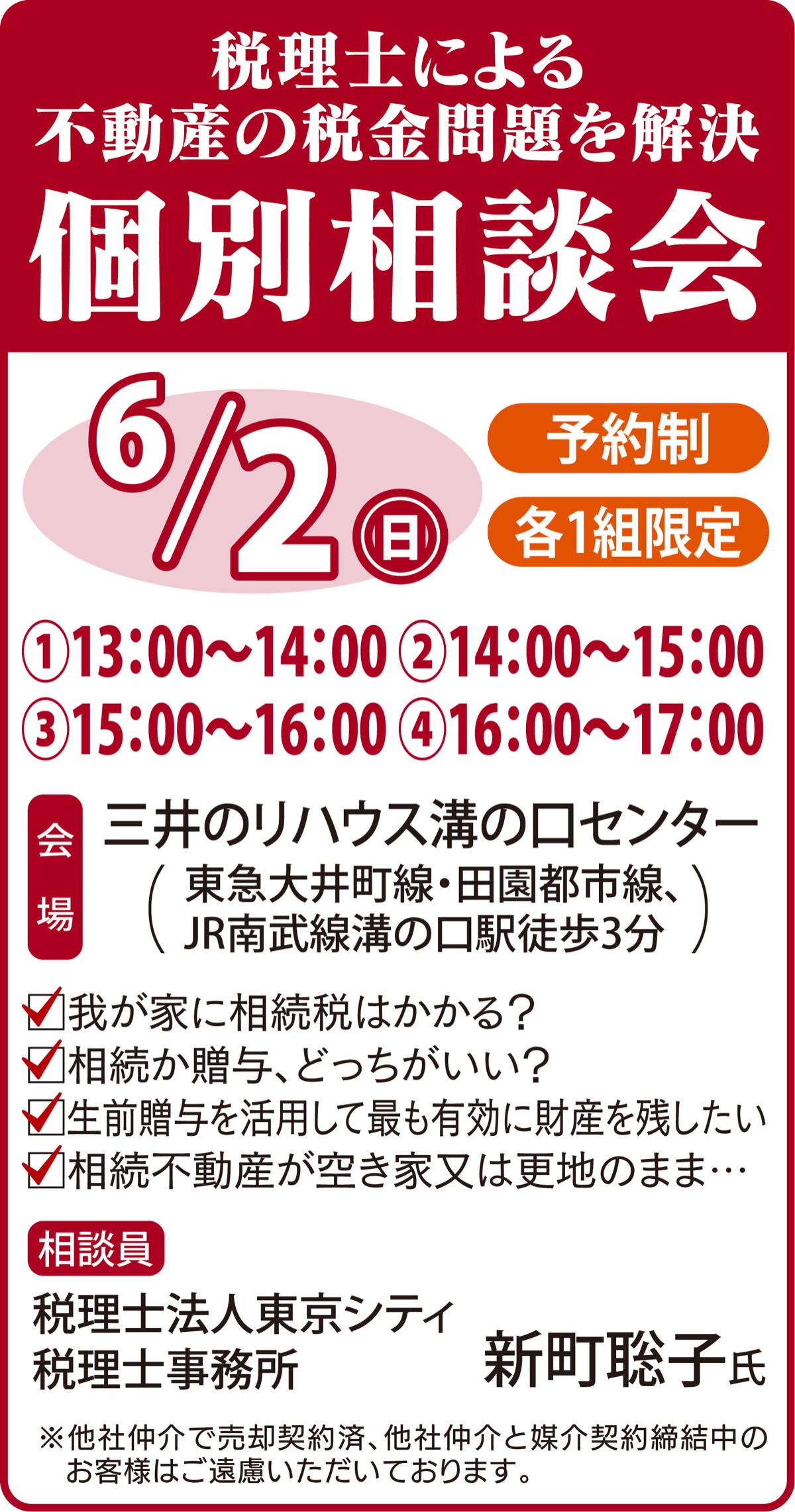 溝の口駅徒歩3分の三井のリハウス溝の口センターで6月2日(日)、専門税理士を招いた個別の無料相談会を開催する。