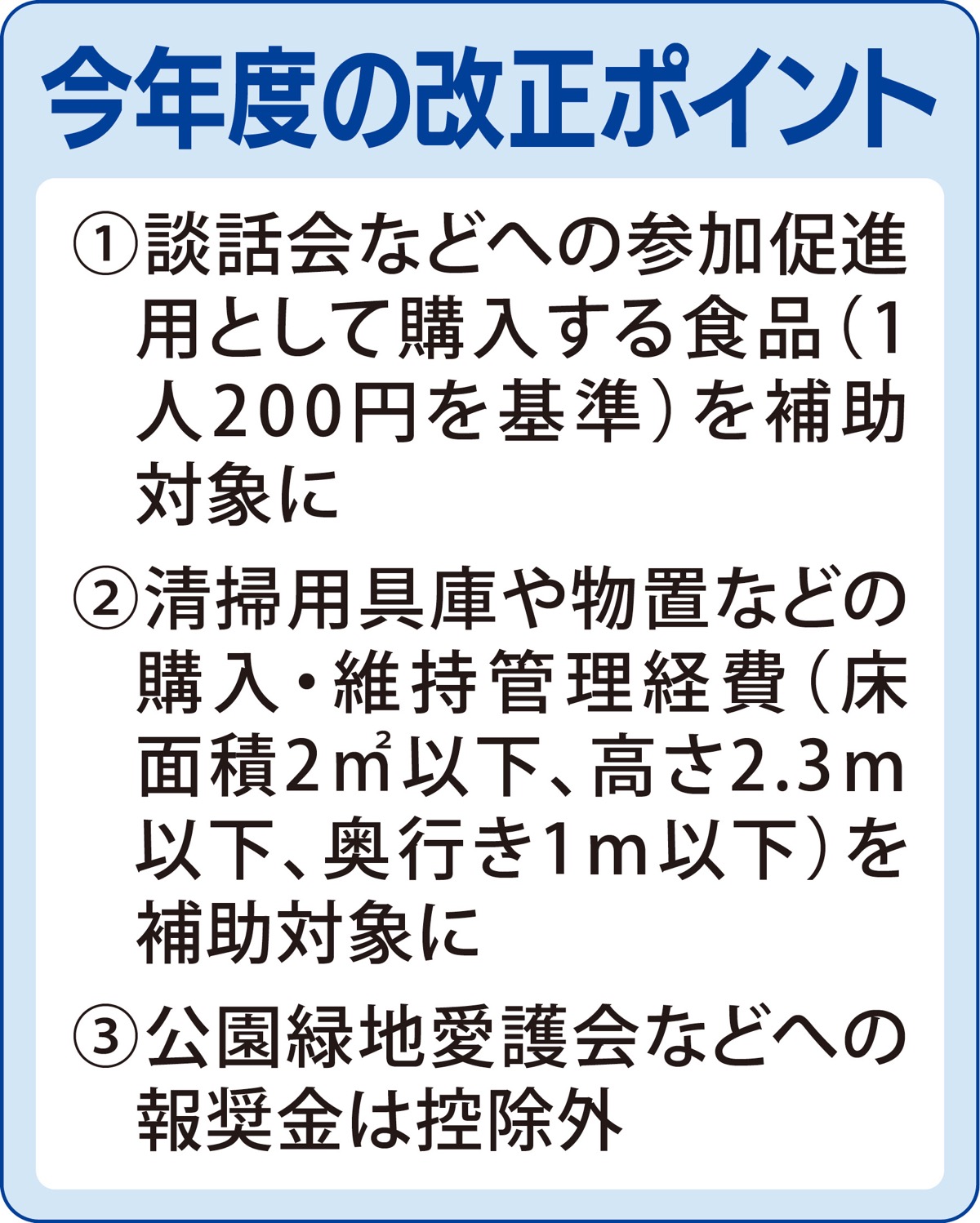 町内会・自治会の活動に対する川崎市の補助金の対象が、今年度から拡大された。会合等で配布する食品や、清掃用具等を保管する倉庫の購入費などが新たに加わった。各町会からの意見や要望を反映し、町会活動の活性化につなげていきたい考え。