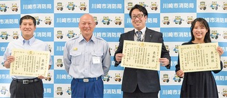 JR南武線・武蔵溝ノ口駅改札口で心肺停止中の人を人命救助した3人が6月10日、高津消防署で田邊浩太署長から表彰を受けた。表彰されたのは、駅を利用中だった河合麻里さんと小林達也さん、JR東日本で同駅勤務の三股松司さん。