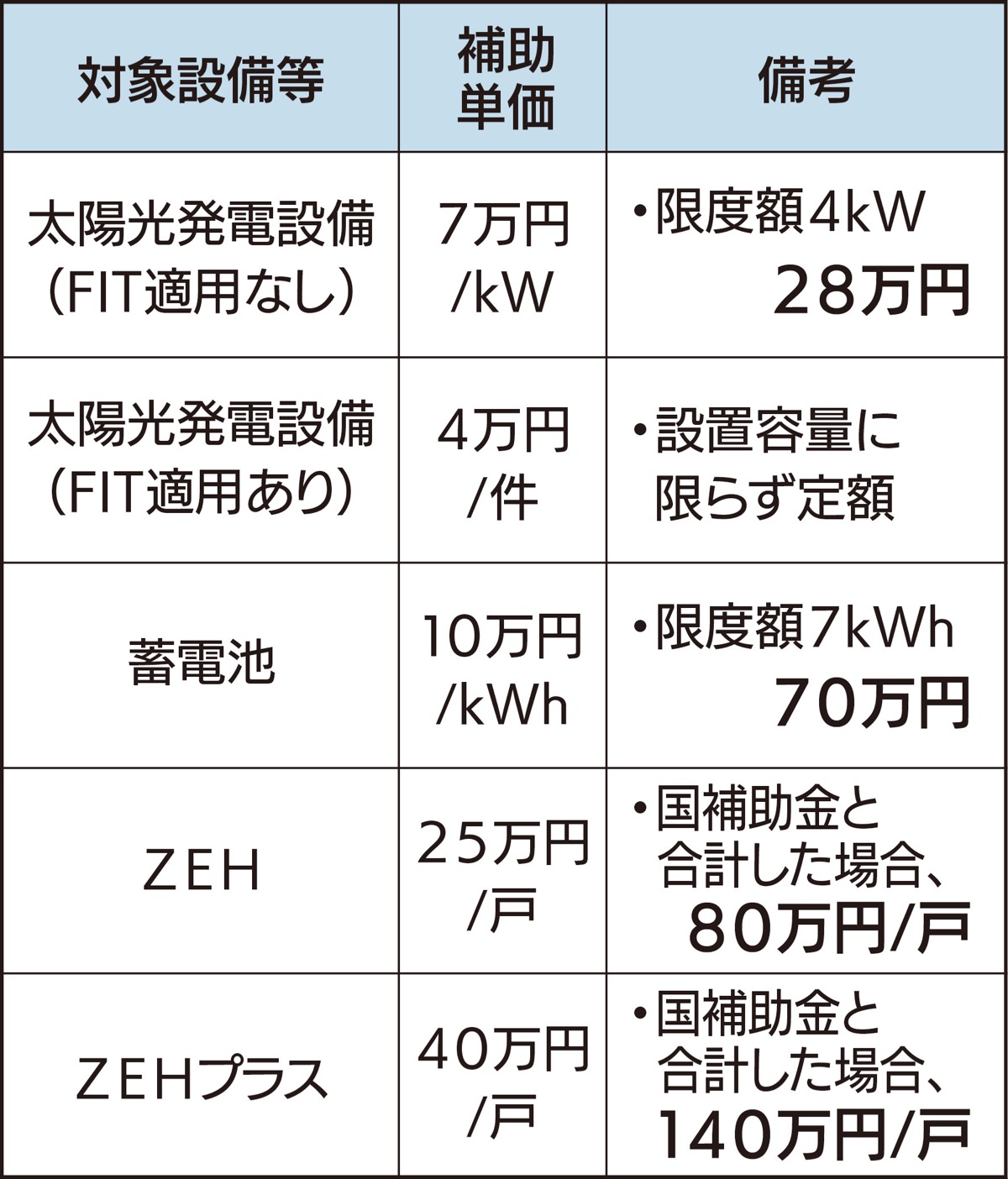 最大補助額は、太陽光発電設備が電力の固定価格買取制度(FIT)適用なしで最大28万円、蓄電池が最大70万円、ゼロエネルギーハウス(ZEH)が一戸25万円、ZEHプラスが一戸40万円。太陽光発電設備は、市の「太陽光発電設備普及事業者登録制度」の登録事業者が施工・設置した設備が対象となる。