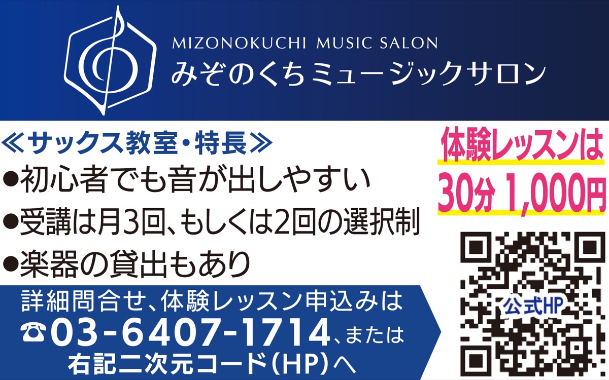 老若男女、世代を問わず「かっこいい楽器」の代名詞ともいわれる「サックス」。溝の口駅にほど近い「溝ノ口劇場」の建物4階「みぞのくちミュージックサロン」では火、水、土曜日に「サックス教室」を開講。受講生を広く募っている。