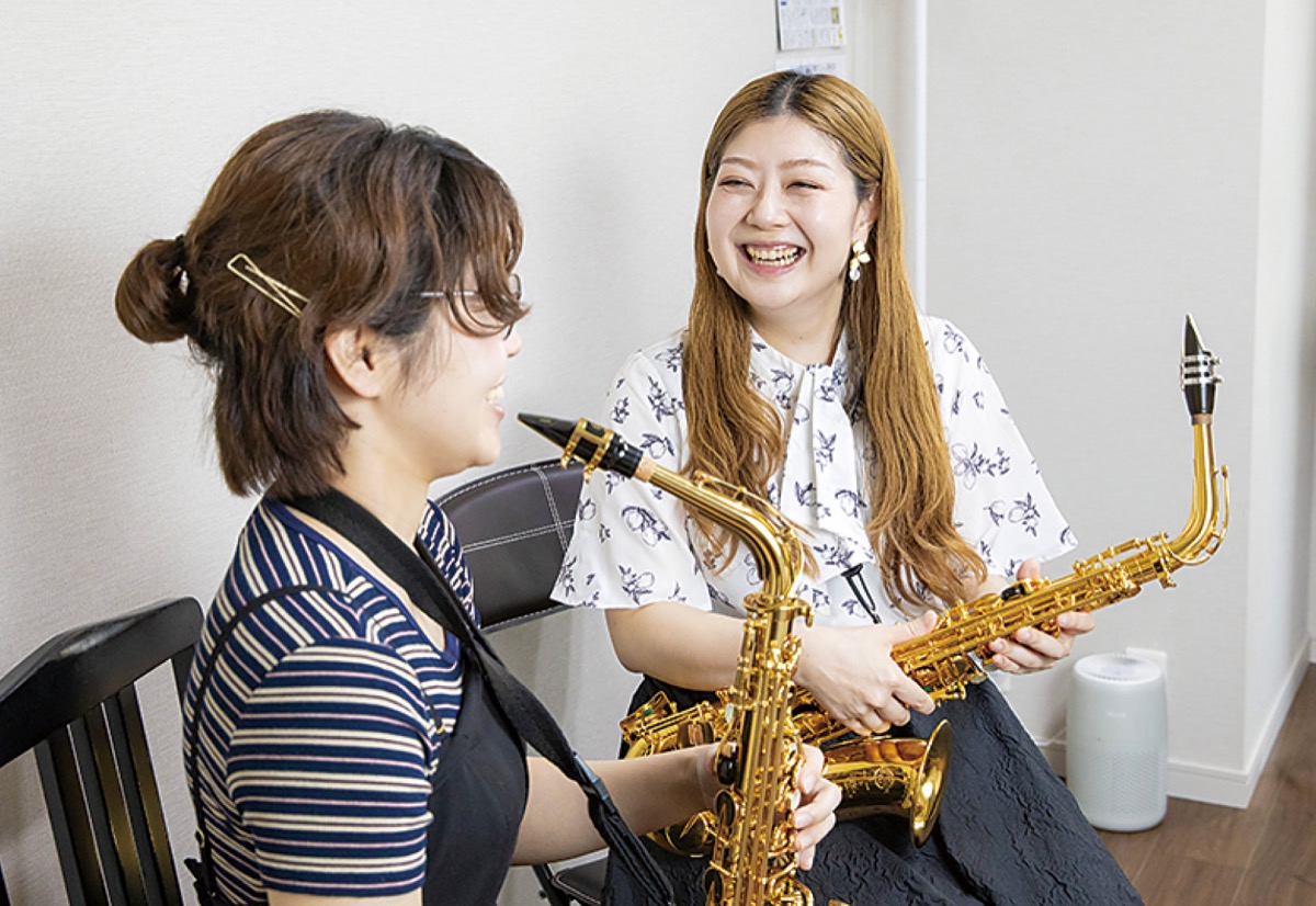 昨年の開講以来、小学生〜80代まで幅広い世代が通う同所。教室代表でもある講師の山川寛子さん(写真左)は「サックスは初心者でも音が出しやすく、年齢を重ねてから始められる方も多い。有酸素運動にもなり健康的ですよ。また、小学生でも持てる小さなサックスもご用意しています。習い事の選択肢の一つにいかがでしょう?」と話し、体験レッスン(30分1000円)への参加を呼び掛けている。